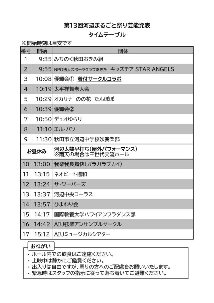 芸能発表部門では16団体が歌や踊り、演奏、ミュージカルなど多彩な演目を披露します。