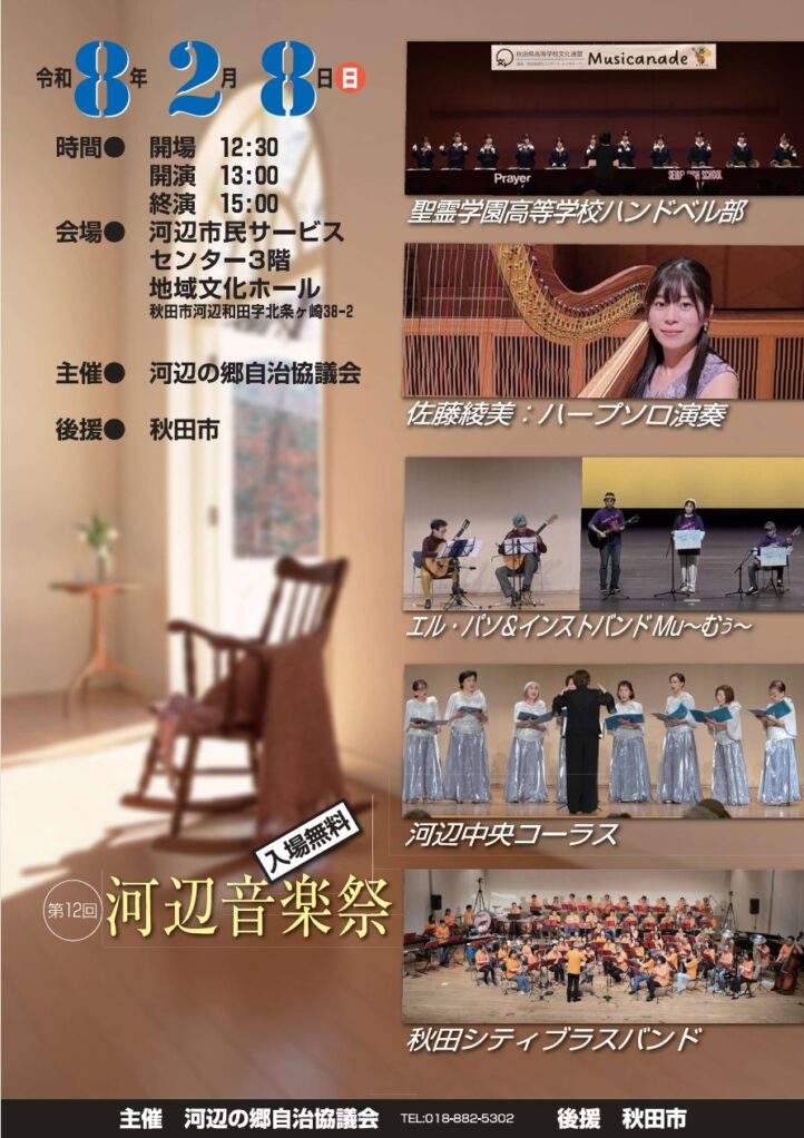 令和8年2月8日(日)、河辺市民サービスセンター3階・地域文化ホールにて、第12回河辺音楽祭を開催します。